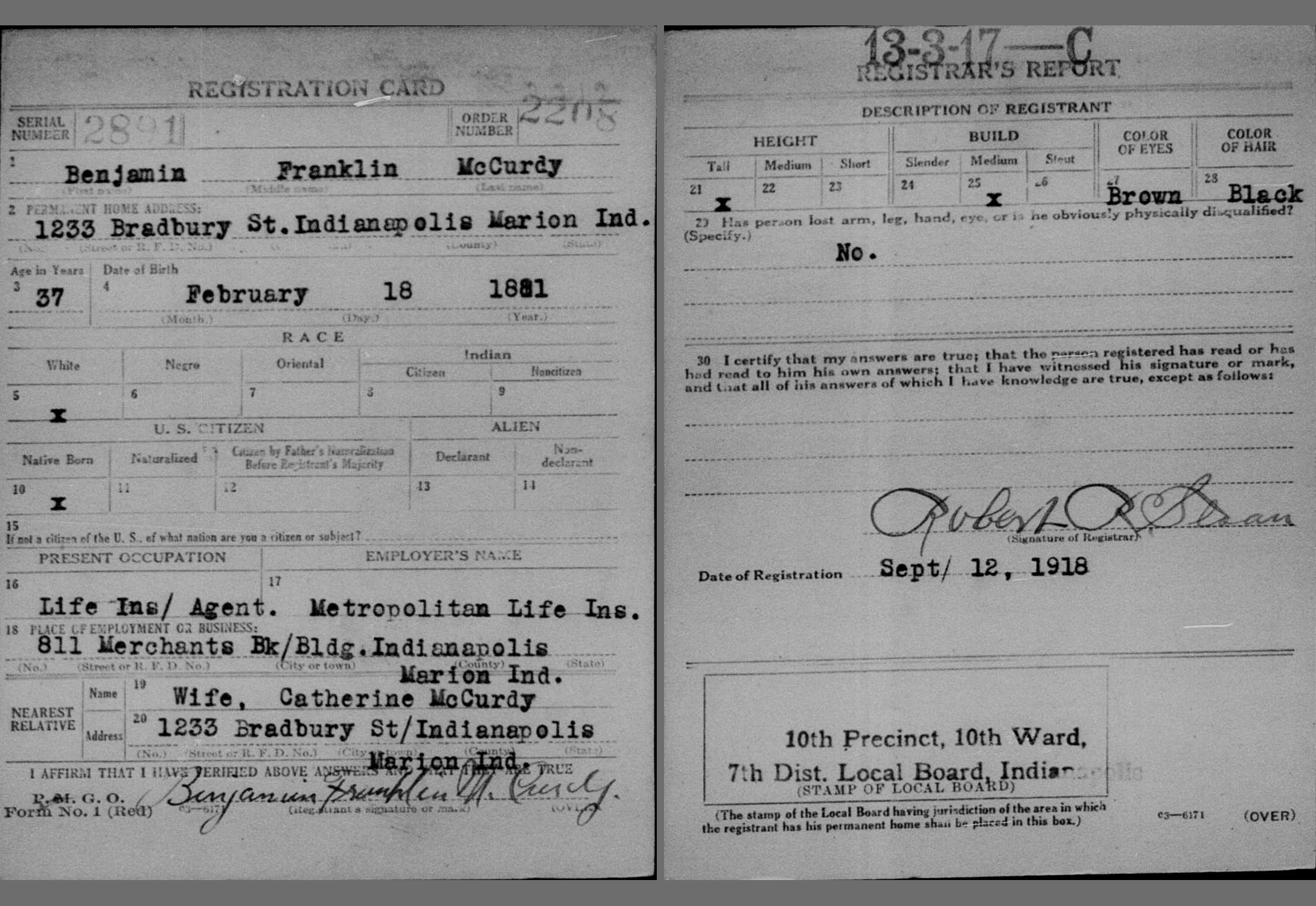 Benjamin Franklin McCurdy, was my great grandfather, and his draftcard is included. I understood that my family had a position overall, of being defensive of equality, as I'll put it here. I was taught from young age that we had special consideration for American Blacks, and I learned their history which included the ships, which could take close to two months to cross the ocean. I also knew at young age about the mistreatment of Blacks even after slaves were freed and I was further instructed that the specifics of the Civil War weren't my business; & by that there was instilled awareness of racist white people who'd use trickery to coerce me to be like them, with one way being discussing the war. There's other phrasing too, that people of the culture who are reminiscent of Antebellum South, and even those that understood the ongoing tensions and could go either way. Wasn't their problem... the racism & all that so who better to b-lame then those who understood something about it all? Why learn about anything unless it'll be a beneficial pay-out, of course how is it possible to know if something will provide some tangible gratification, validation, etc., unless it's pursued? So there's inherent risk with any endeavor and so if it can also be easily rebuffed as unnecessary, or counterproductive somehow, then the risk increases to the point where people will tend to shun anyone who posits to challenge oppression. Why be friends with somebody who'd be ridiculed at some point? There are people throughout history who'd lost the ability to "fit-in" but yet had contributed enormously to the benefit of humanity. Quite the opposite of the stereotypical villian, but the two could be effectively switched in context, is the point. A person may overcome some stigma (from trauma) and become better (more aware & compassionate) people as a result, and then as they return to the world, as it were, people might suggest they wasted their time in the whole affair, they could have been enriching themselves instead ... where the implication is that it was the person's own choice to be "held back" (by the trauma) and any "betterment" would've come anyway ... no different than what they have, after all, of course they know all about (whatever the topic is) ... but they also have nice house & all the trimmings & here, have some wine (type thing).